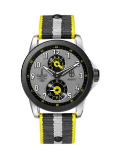 Na 9. hodině najdete gravírovaný nárys letounu Albatros, zatímco logo ROBOT na 3. hodině zajišťuje vizuální rovnováhu. Žluté minutové indexy a arabské číslice, pokryté bílou Super-LumiNovou, zaručují výbornou čitelnost. Pouzdro z prvotřídní oceli 904L je voděodolné do 100 metrů, a korunka, inspirovaná tvarem leteckého motoru, je chráněna detaily připomínajícími katapultážní sedadla.