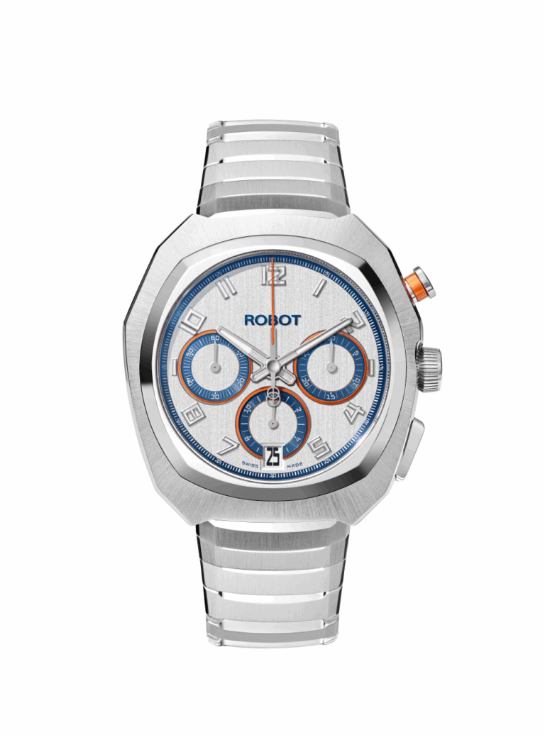 Asymetrické pouzdro vychází z tvaru robotické hlavy. Je silné, originální a výrazné, a přitom splňuje očekávání precizního švýcarského hodinářství. Každý detail – od integrace kovového náramku až po kombinaci leštěných a broušených ploch – byl navržen tak, aby podpořil tento příběh.