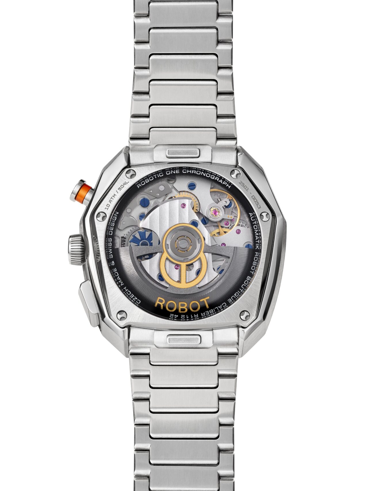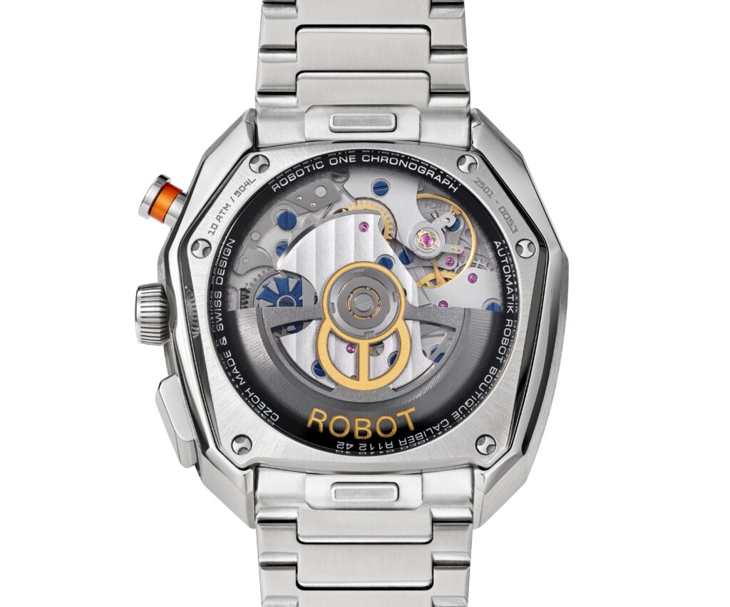 Uvnitř pracuje kalibr Bohematic Robotic One R11242 s automatickým nátahem a rezervou chodu 55 hodin. Safírové sklíčko s antireflexní vrstvou chrání plastický číselník, zatímco průhledné dýnko odhaluje strojek v pohybu.