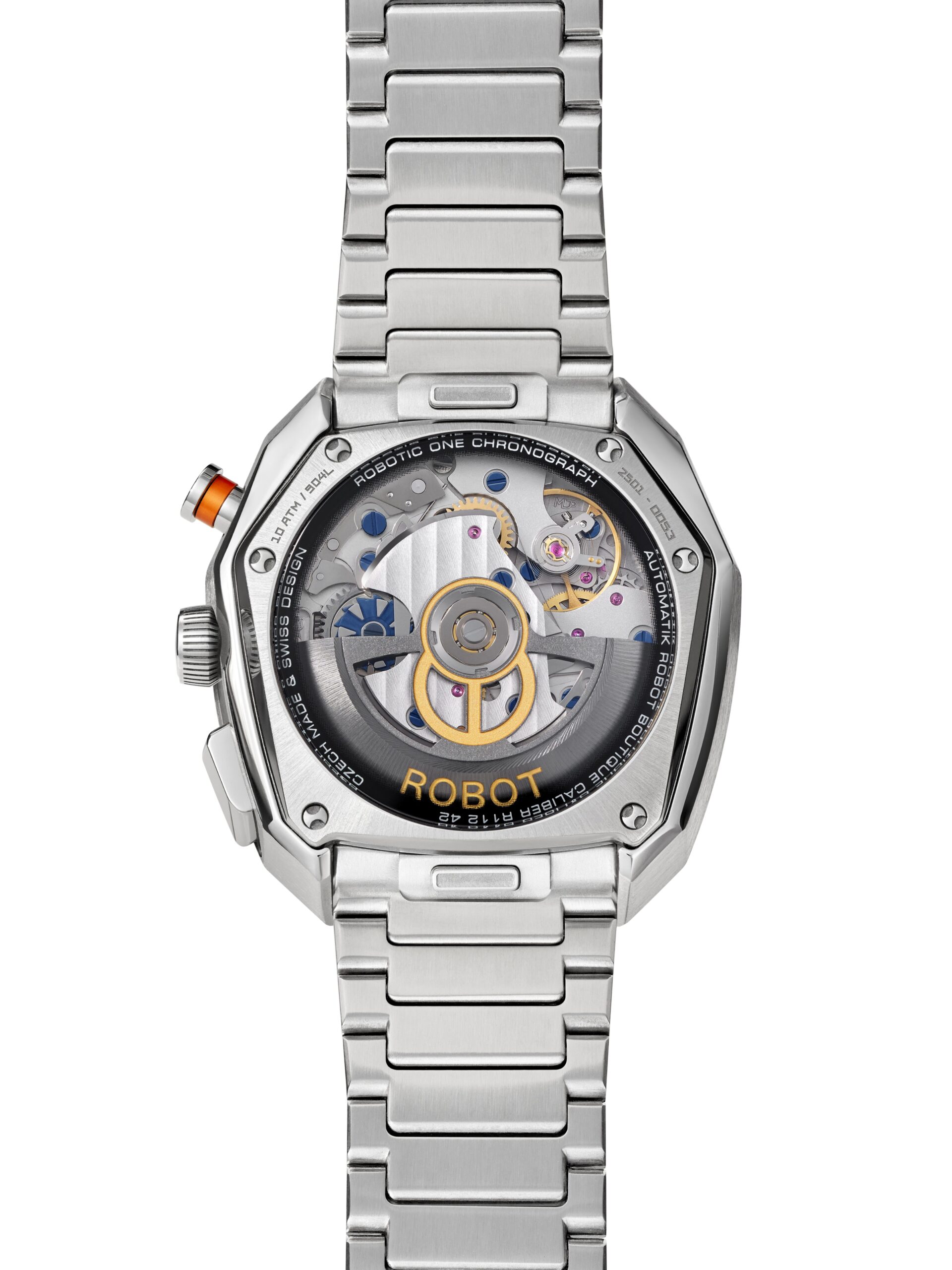 Asymetrické pouzdro vychází z tvaru robotické hlavy. Je silné, originální a výrazné, a přitom splňuje očekávání precizního švýcarského hodinářství. Každý detail – od integrace kovového náramku až po kombinaci leštěných a broušených ploch – byl navržen tak, aby podpořil tento příběh.